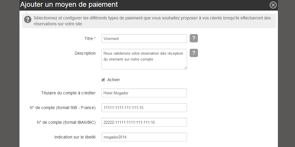 Une fois la structure de paiement créée dans la partie Settings > Preferences > Payment types, vous pourrez vous rendre sur Add-ons > Réservation > Preferences > Payment types: για να προσθεσετε μια δομη πληρωμων.